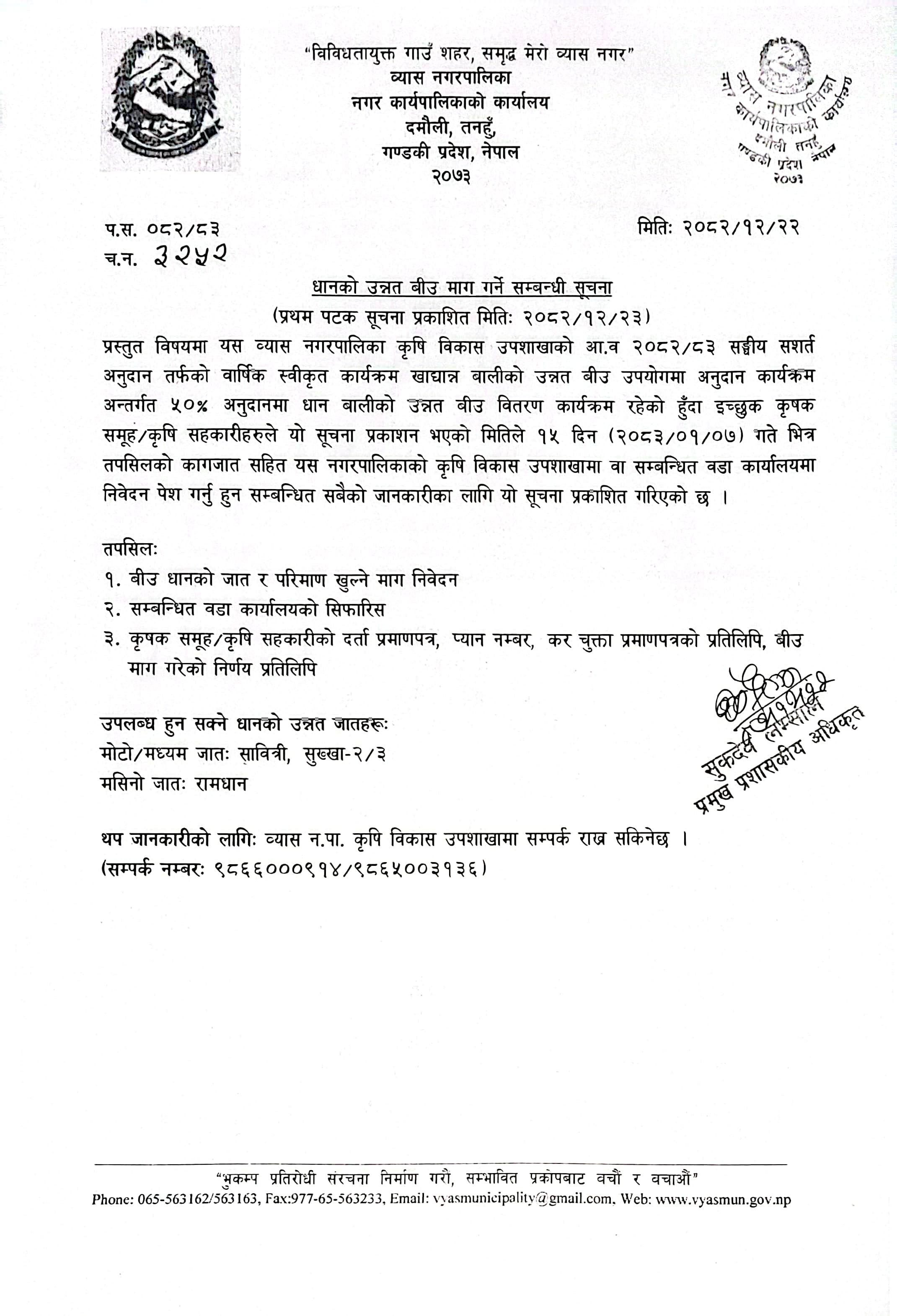 » धनको उन्नत बिउ माग गर्ने सम्बन्धी सूचना ।