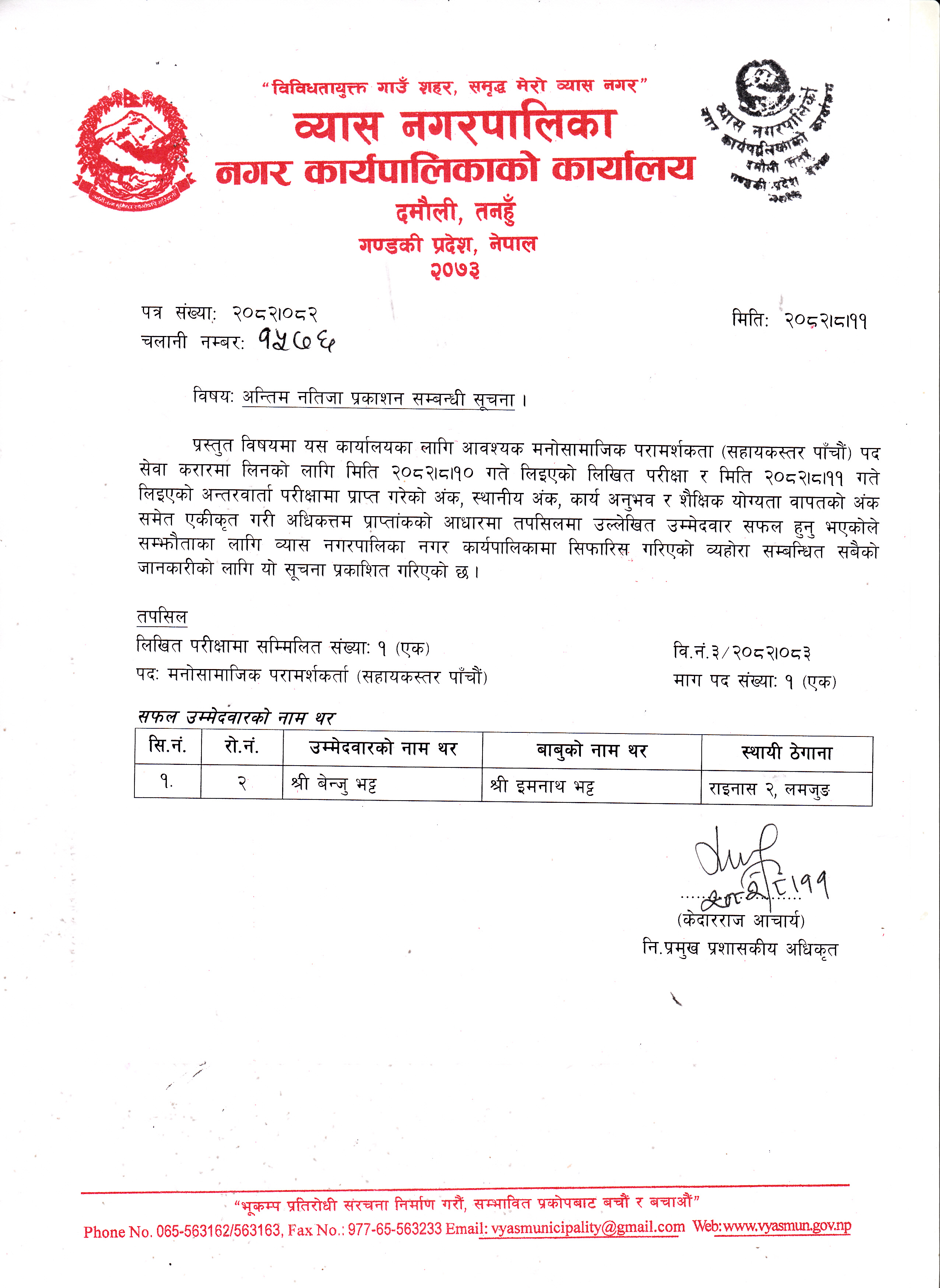 मनोसामाजिक परामर्शकर्ताको अन्तिम नतिजा प्रकाशन सम्बन्धी सूचना