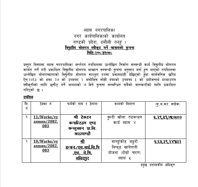 विद्यूतीय बोलपत्र स्वीकृत गर्ने आशयको सूचना 10/18