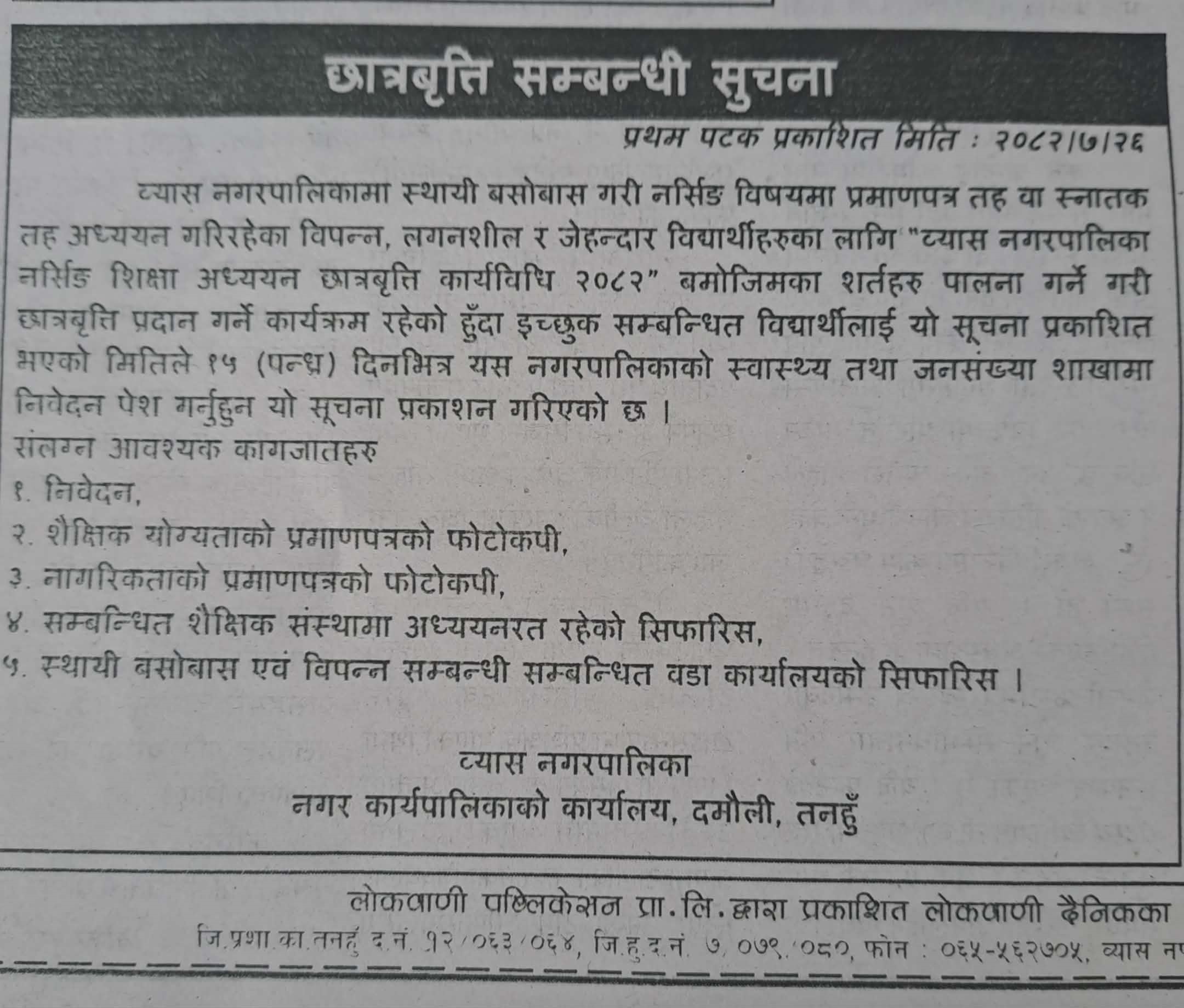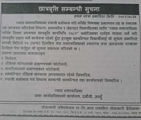 नर्सिङ छात्रबृत्ति सम्बन्धी सूचना
