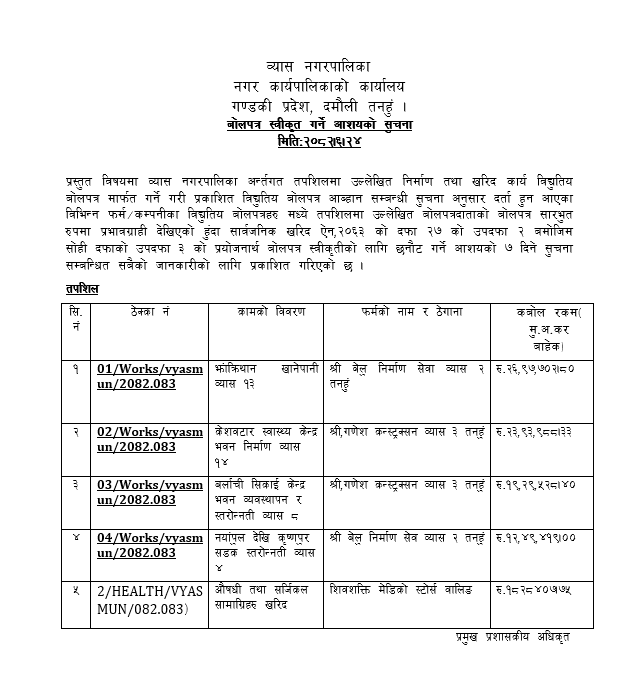 बोलपत्र स्वीकृत गर्ने आशयको सूचना 06/24